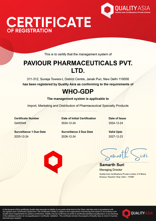 Company has also awarded ISO 9001 : 2015 as well as WHO -GDP CERTIFICATE for Good Distribution Practices ensuring high compliance and high standard of ethical marketing and distribution.
